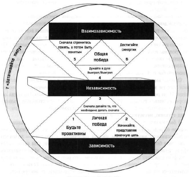 Первые три навыка («Будь проактивным», «Начинай, представляя конечную цель», «Сначала делай то, что нужно делать сначала») учат управлять собой, ставить цели и расставлять приоритеты. Следующие три («Думай в духе „Выиграл-Выиграл“», «Сначала старайся понять, потом быть понятым», «Достигай синергии») помогают строить крепкие отношения через сотрудничество и эмпатию. Последний навык («Затачивайте пилу») напоминает о необходимости постоянного развития во всех сферах жизни.